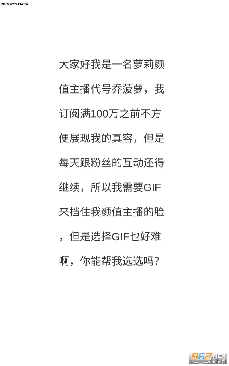 大家好我是一名萝莉颜值主播代号乔菠萝,我订阅满100万之前不方便展现我的真容,但是每天跟粉丝的互动还得继续,所以我需要GIF来挡住我颜值主播的脸,但是选择GIF也好难啊。