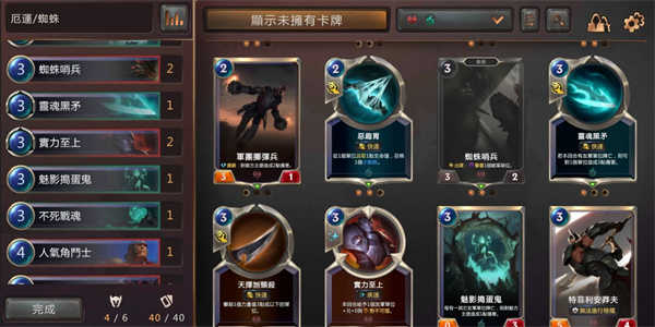 第一套卡组融合了暗影岛与诺克萨斯的特点,选用前期高效的伊莉丝和后期爆发力强劲的德莱厄斯作为英雄牌。这套卡组的优势在于前期低魔力消耗卡牌众多,且具备多种指向性法术牌,能够精准击杀棘手目标,即便战斗拖入后期,德莱厄斯依然能发挥一锤定音的作用。