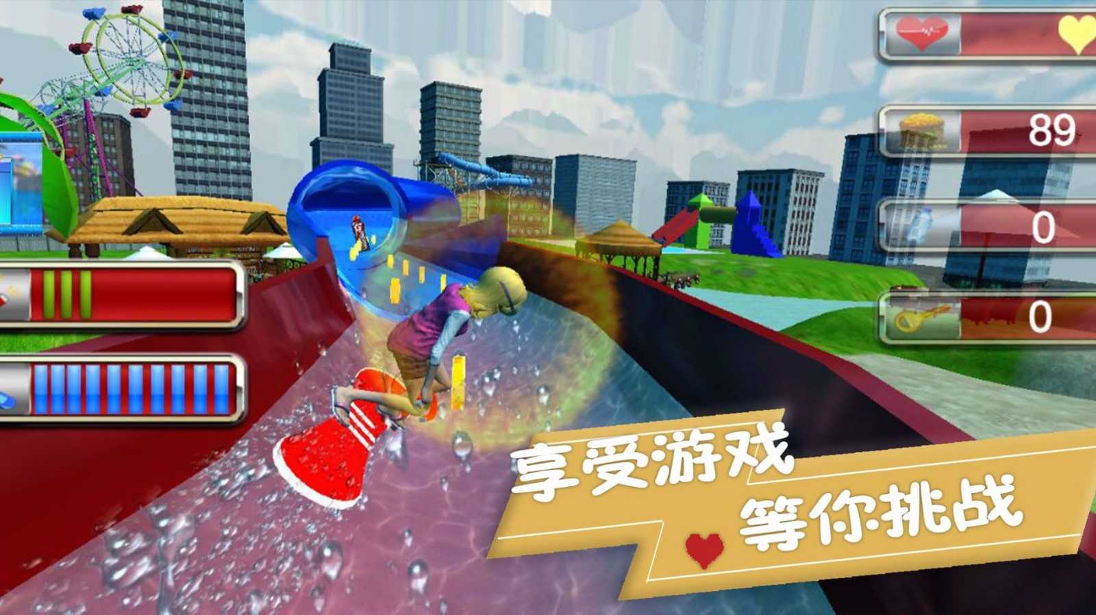 大家都去过水世界游乐园吗?去过的朋友肯定对水世界的水滑梯印象很深吧,那种刺激的感觉可真不比云霄飞车差。今天为大家带来的这款极限冲冲冲,就是这样一款能带大家体验刺激水滑梯感受的跑酷游戏。玩家将会在水滑梯上冲刺、跳跃和闪避障碍物,力图获得最高的评分,这款游戏的画面非常出色,有许多细节和效果都非常精美,是一款不容错过的佳作。