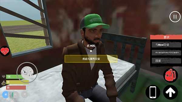 3、右侧要求”就是任务目标,下楼去和疯mosi交谈,将屏幕中心的白色光点对准角色即可触发对应的动作,按此与摩西交谈”。