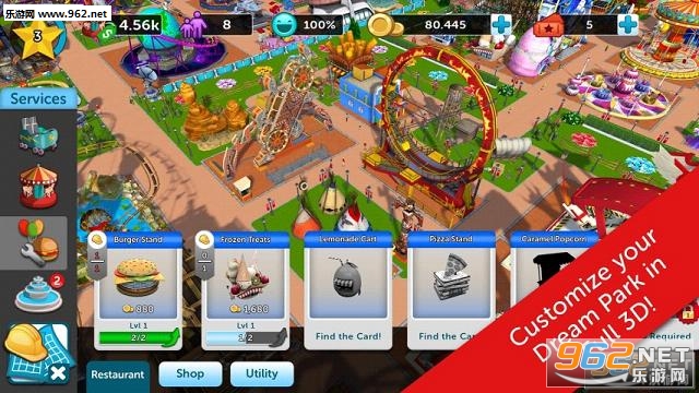多样化游乐场经营,超过200种游乐场景设施,全3D动画渲染,让玩家可根据喜好定制自己梦想中的乐园。