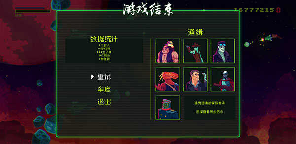 7、注意左上角的生命值条,当生命耗尽时游戏结束,此时会显示本局击杀记录及BOSS信息,可以选择重新开始或返回机库。