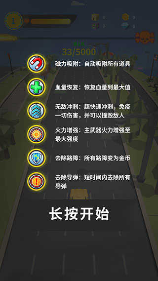 2、此时会出现游戏内各类道具的介绍页面,长按屏幕即可开始游戏。