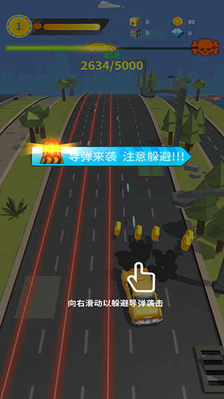 5、当导弹来袭时,屏幕上会出现红色警告轨迹,同样向右滑动即可躲避。