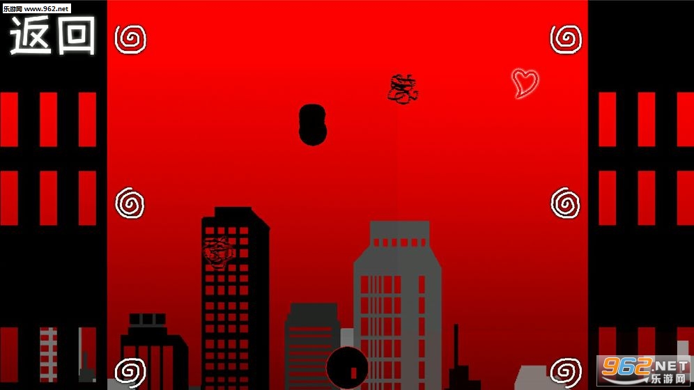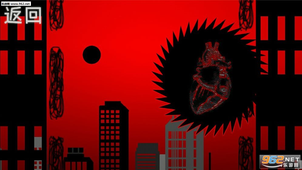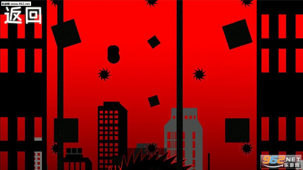2、简洁的游戏画面,非常特殊的游戏背景,落日的红色画风和各种黑色的建筑;