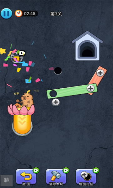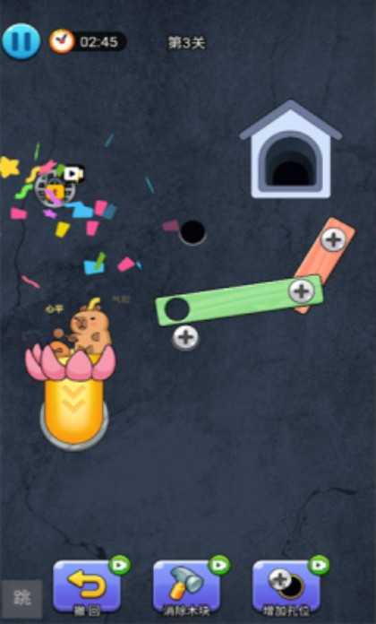 2、玩家需消除螺丝以解救卡皮巴拉,此独特机制赋予游戏新颖体验。
