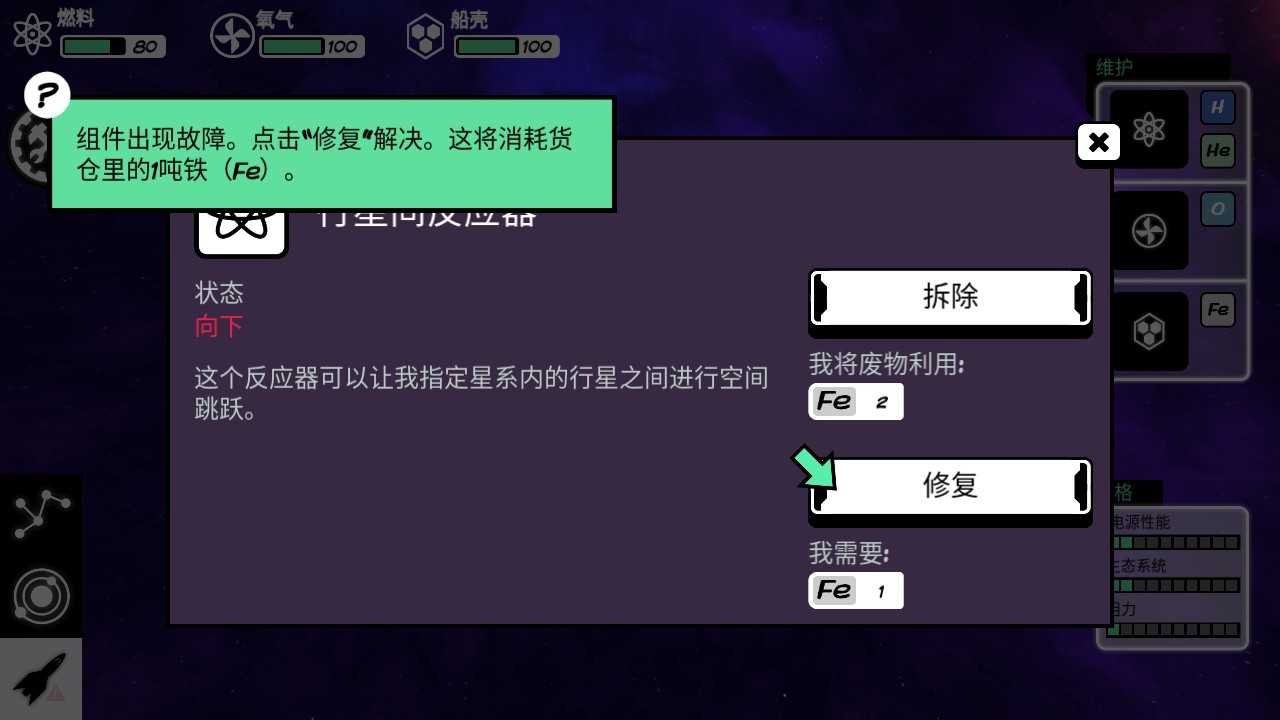 6、组件出现故障。点击修复"解决。这将消耗货仓里的吨铁。