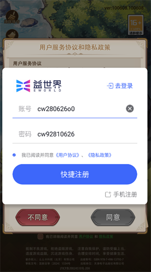 首先我们点击快捷注册。系统会帮我们自动输入一个账号和密码。