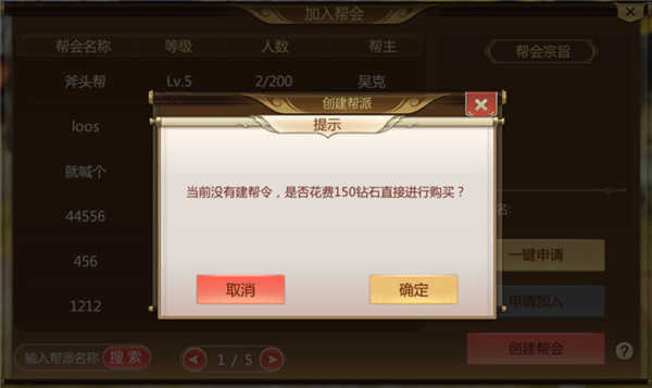 消耗建帮令可创建帮会,若背包内无建帮令,也可花费150钻石直接进行购买。