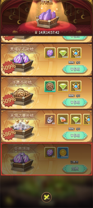 ②每周、每月免费礼包:每周礼包可领取10个星陨矿石,相当于180钻石,每月礼包可获得20个荒域矿石,该道具的价值远高于星陨矿石,按照两倍算,相当于360钻石,平均到每日,相当于180/7+360/30,约为38钻石。