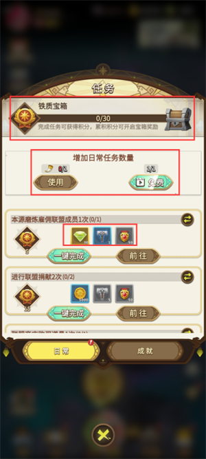 首先需要了解的是,日常任务的每日更新数量与不朽荣耀等级有关,起始状态为每日刷新3个普通任务+1个联盟任务,随着不朽荣耀等级提升,会增加每日任务刷新数量(也可通过看广告增加1个任务)。另外,日常任务可以单个刷新,免费刷新次数同样受不朽荣耀特权等级影响。