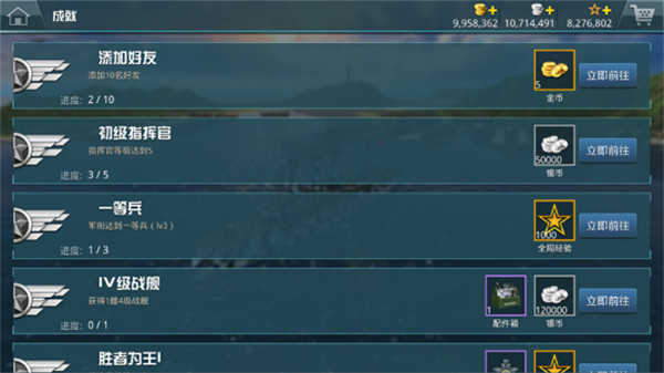在《战舰猎手》中,各位舰长们只要完成所指定的成就任务,就可以获得相对应的奖励哦,任务种类非常之多,奖励也非常丰厚,完成成就后可获得金币、银币、全局经验,更有任务会奖励配件箱、战舰订单、水兵调令这些珍贵的道具哦。