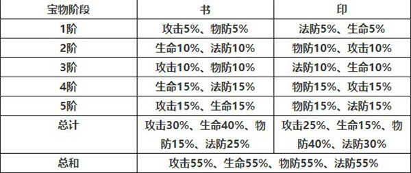 从统计表中可以清晰明了的看到,宝物书的幻紫,攻击与生命的收益更高,而宝物印的幻紫,物防法防这种双抗的收益更高。从综合角度来说,双宝物幻紫,可以将武将单体的思维统一提高55%,收益还是肉眼可见且颇丰的。