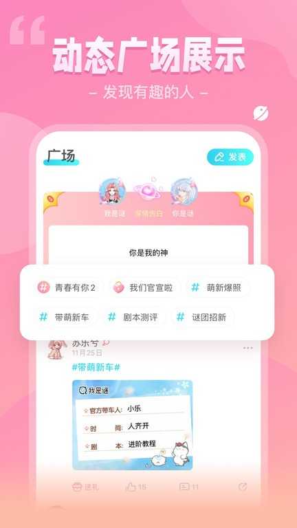 为剧本杀、谋杀之谜爱好者寻找伙伴。拥有丰富的剧本,超快的匹配,稳定的即时语音。让你剧本杀起来更加轻松。飙演技、角色扮演,欢乐竞技。戏精之间的大对决,推理与谎言共存!