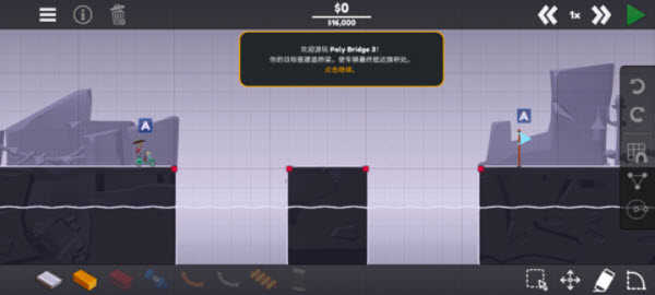 3、正式开始闯关,需要点击左下方的各种建筑材料来修建桥梁。