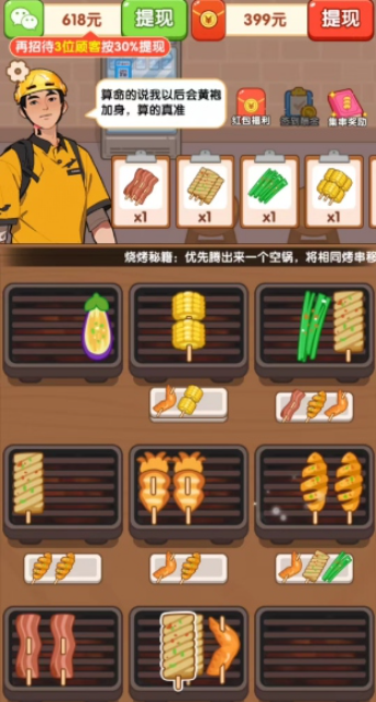 2、通过将三种相同烧烤移动到同一烤炉上来进行消除,并完成对应的订单。