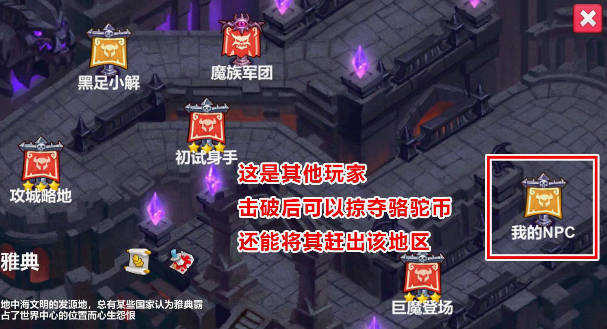 4、黄色标记的据点属于其他玩家,成功击败驻守部队后,你可以将对方驱逐并占据该地点。