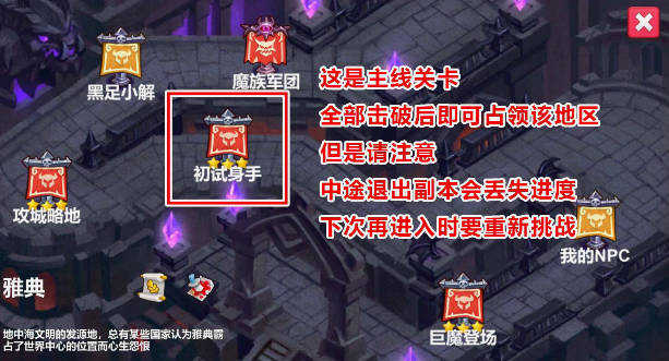 3、副本中包含多种类型的关卡,其中主线关卡(如图中标记部分)击败后即可占领对应据点,为后续发展奠定基础。