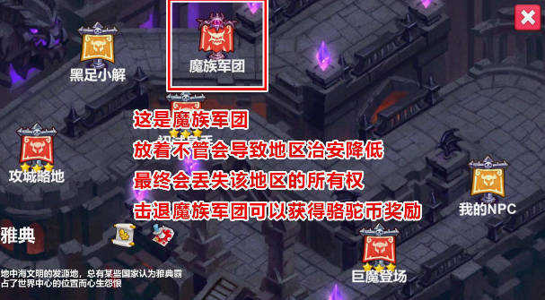 5、魔族军团的据点若不及时清除,会导致当地治安恶化,最终可能导致你失去对该区域的控制权。