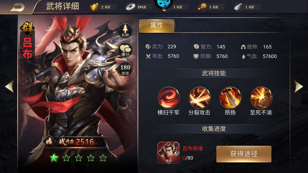 作为人中吕布,马中赤兔”的代表,他可以通过招募、武将商城、贵族特权以及拜访名将等方式获取。作为顶级输出之一,他的加入将极大提升你的战力。