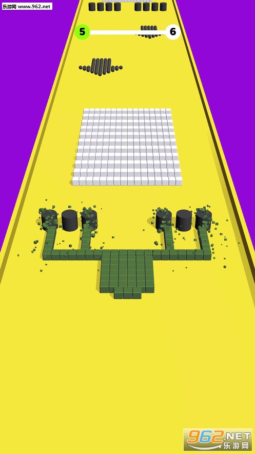 玩家需要利用大的积木块快速的粘住道路上面小的积木块,增大自己的数量和体积,将要求数量的积木推入洞中闯关,