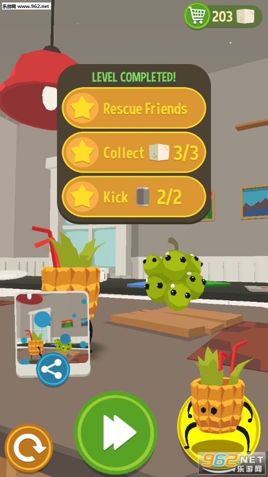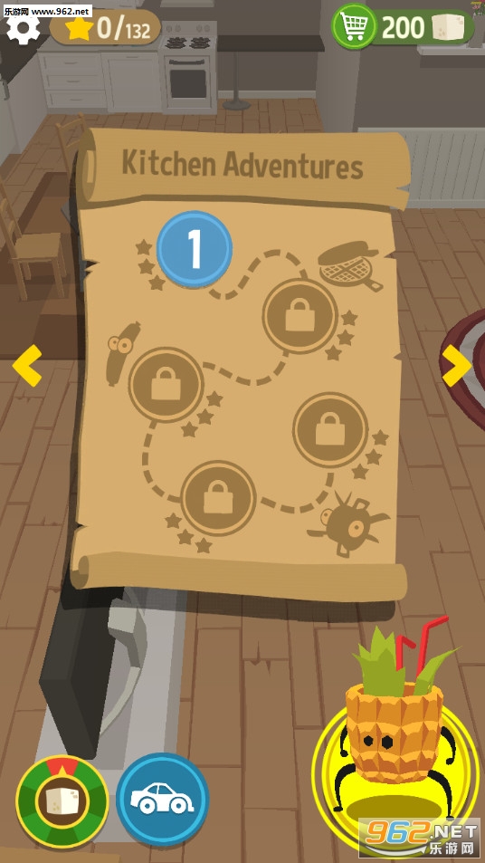 主角小菠萝,通过完成不同的任务来通关各个关卡,获得金币之后可以装扮你的主角和解锁更多可爱的主角。游戏中以关卡的形式进行推进,在每一个关卡中都会包含不同的任务,不过任务主要分为几个类型,首先是需要玩家顺利的解救出自己的小伙伴,另外在游戏场景中会包含许多不同的白色糖块,玩家可以收集它们,利用糖块玩家可以解锁出更多不同的物品进行控制,此外,在场景中还有一些特殊的物品需要玩家去触碰,这些物品在游戏中都会用星星进行提示,玩家只需要控制主角触碰它即可,游戏中并不限时间,所以难度还是比较小的。