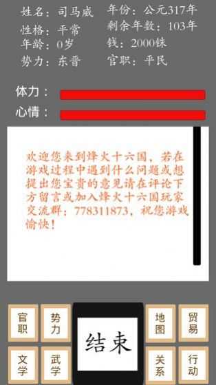 烽火十六国游戏是一款古代战争题材文字策略游戏,以十六国战争时期为背景,通过文字的形式为大家打造了一个动荡纷争的时代,让你化身为指挥官,在这里招募文人武将为你所用,指挥千军万马奋战沙城,奋勇杀敌,打造属于你的天下!喜欢的网友赶快来下载体验吧!
