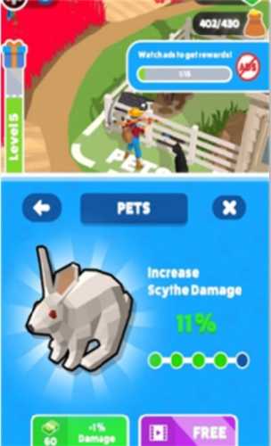 多样武器 自由选择:游戏内准备了多种风格迥异的武器供玩家挑选,每一种都具备独特的功能与视觉效果。从基础的镰刀,其扇形攻击范围能一次性清除大片草丛;到高科技电锯,发动时伴随着震耳欲聋的轰鸣声,所向披靡;再到神秘的魔法权杖,释放的能量波能够远程摧毁目标。玩家可以根据自身喜好与策略需求,灵活切换武器类型,尽情体验不同的收割快感。
