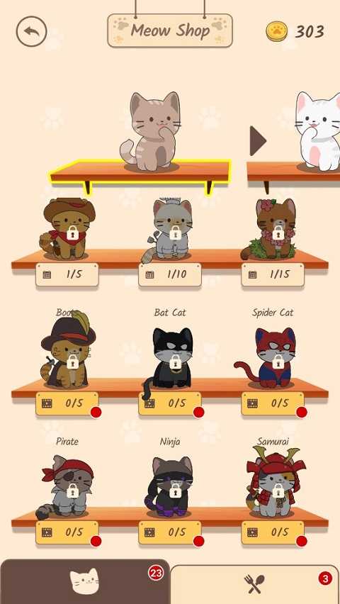 如果你对初始的灰白猫感到厌倦,不妨换换新造型吧!你可以从多种皮肤中挑选心仪的猫咪品种:可爱猫咪、黑猫、蒙蒂猫、丸猫、配音猫、乔利猫等。或者将猫咪变成完全不同的模样,如蜘蛛猫、皮卡丘猫等,把它们统统纳入收藏!这些毛茸茸的小家伙都属于你。
