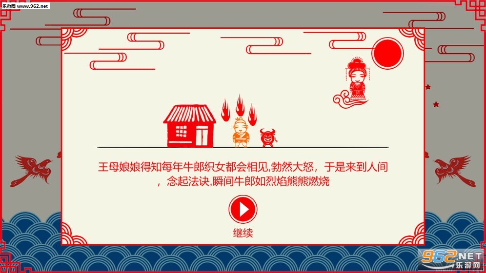 游戏采用闯关的形式,操作方式很简单,极易上手,融入了中国传统特色的元素,让玩家通过一种全新的方式,重温牛郎织女的经典爱情故事,在繁忙的生活中发泄压力!