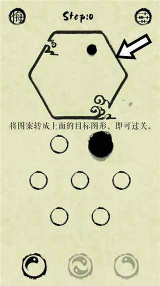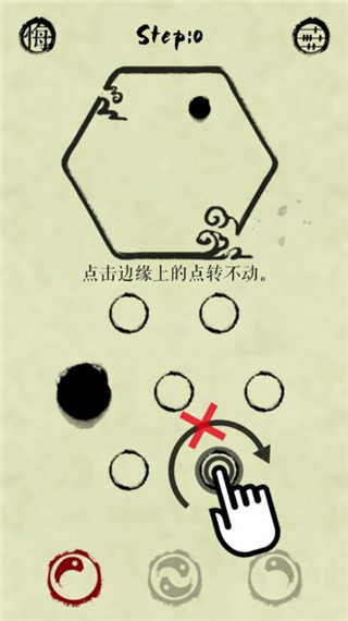 在游戏中,每一个墨点都能影响其周围小六边形中的六个点进行旋转,而旋转的方式分为三种:顺时针一格、逆时针一格以及大周天旋转。具体来说,一格即表示一个位置的变化,通常两步以内的移动需要通过累积多个一格移动来实现,或者结合大周天旋转与一格移动完成目标。大周天旋转是指以某个点为中心,将六边形上的任意墨点直接对调到对面的空点上,适用于墨点距离目标位置较远的情况。为了减少不必要的步骤损耗,建议优先使用大周天旋转实现一步到位,再辅以一格微调。