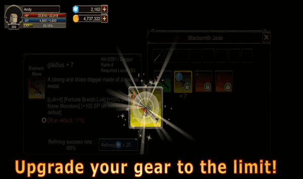 3、装备锻造:玩家可以在铁匠铺强化装备,提升战斗力。部分高级装备还可以镶嵌符文,获得随机的特殊效果,从而打造出最强装备。