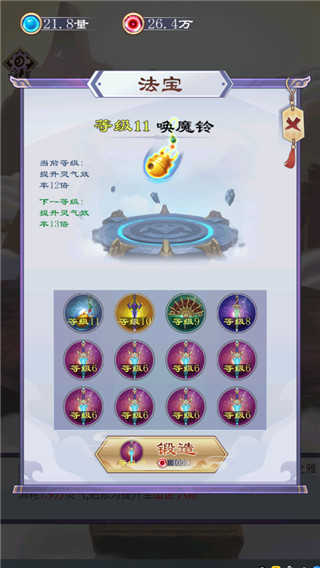 法宝:法宝的升级需要消耗寿元来完成,通过寿元来购买法宝,并将两个相同的法宝进行两两合成,便会将法宝提升至一个新的阶段,法宝的属性则可以帮助提升修炼时的灵气聚集效率。