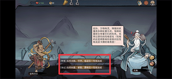 1、通过开局先天资质、每次怪物的抉择都将改变自己的性格构成,一个好的性格构成,往往能加速你的卡组构成。