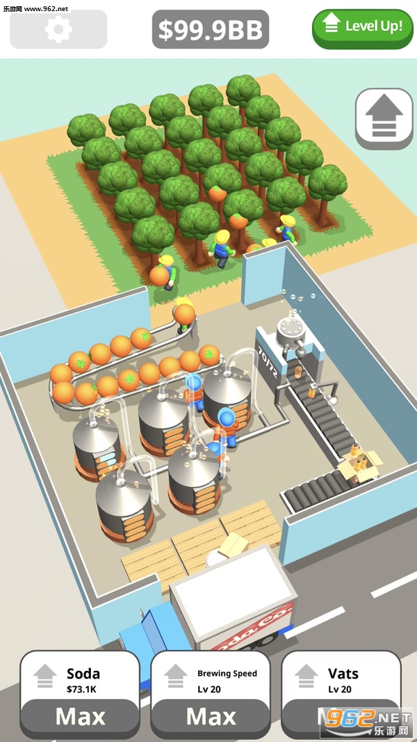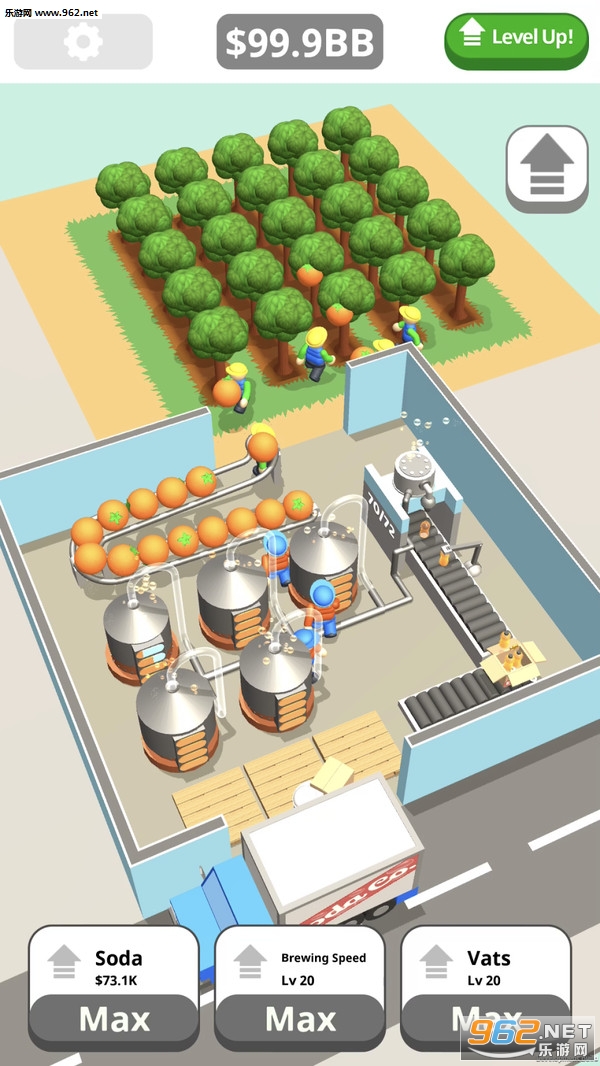 给你的工厂加点汽水!在你的果园里种桔子,尽快收割,让它们在大银缸里发酵,通过管道,进入瓶子里,把它们装箱,放到货车上。赚尽可能多的钱来扩大你的工厂,成为一个苏打饮料亿万富翁!