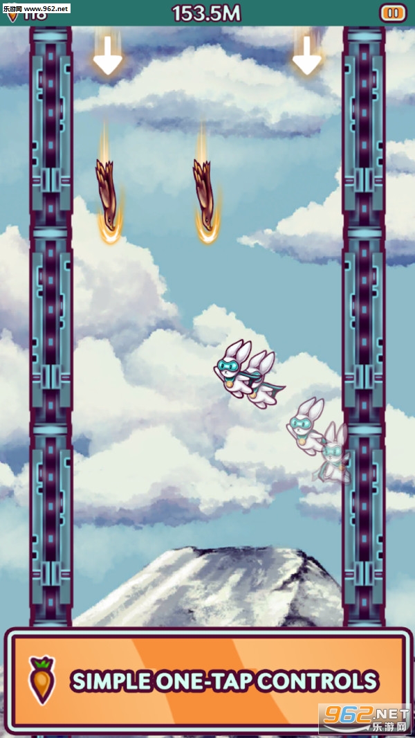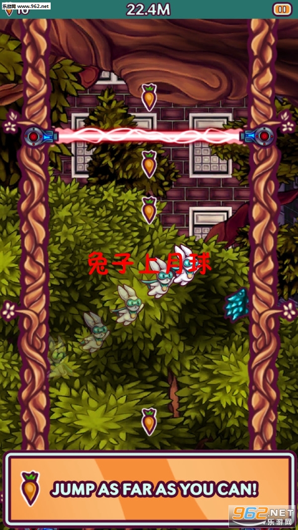 《兔子上月球安卓版》是一款非常有意思的跳跃类休闲闯关手游,游戏画风非常的清新脱俗,游戏玩法也十分简单有趣,点击屏幕操控兔子不断的向上跳跃拾取胡萝卜,躲避两边墙壁上的各种障碍物,感兴趣的玩家快快来下载体验吧!