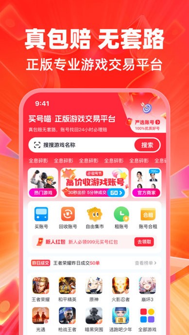 买号喵交易平台官方版上线,买号喵app是由重庆游界智联科技有限公司官方出品的集买号、卖号、租号、账号回收于一体的安全可靠的游戏交易平台,交易账号覆盖市面上热门手游、端游及Steam游戏,如王者荣耀、和平精英、原神等等统统都有,欢迎体验!