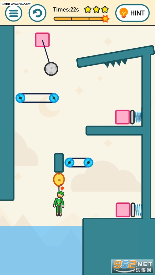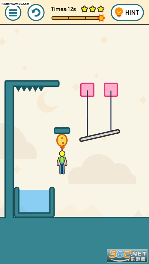 游戏的操作虽然很简单,但是每一关都有不同的物理谜题需要你来解决,你需要把握时机,在合适的时机点击屏幕,帮助火花侠顺利的落入水中,游戏有时间的现实,难度更大!