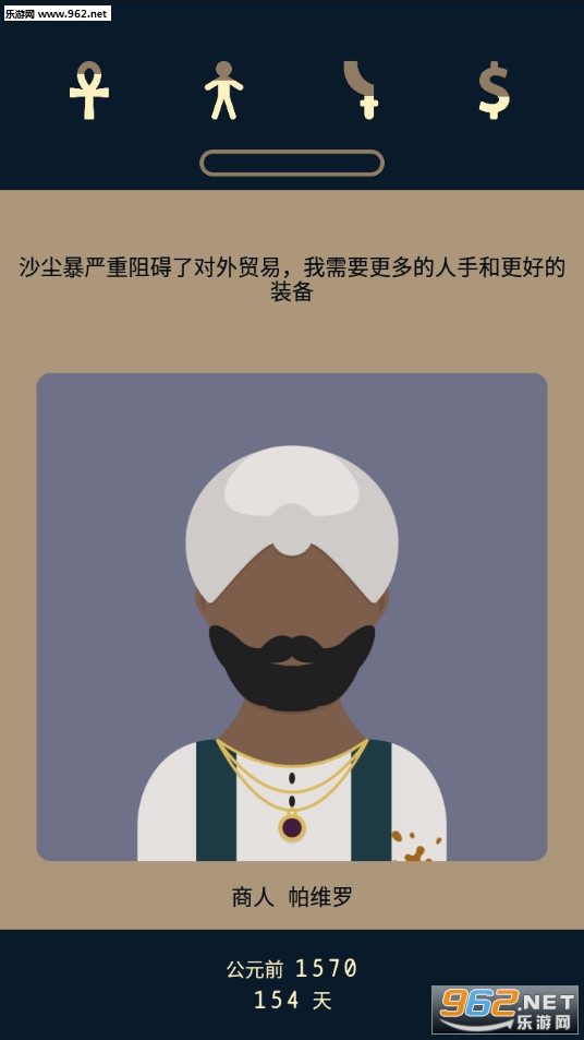 《失落2前夜》是一款卡通风格的文字冒险游戏,游戏中玩家将回到公元前的古埃及,成为埃及的法老。每天你需要对一些政策和事件进行判断,维持王权,人民,军队和经济的稳定,游戏中你需要做出各种取舍,平衡中庸才能活的长久,赶快下载体验吧!