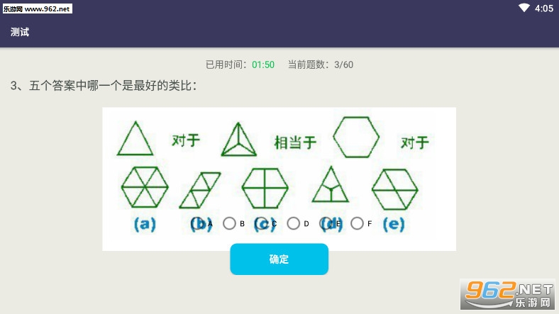趣味的智商测试软件,朋友们需要在软件中做满六十道题目,根据选择答案和自己所填写的年龄来计算你的智商,当然准不准小编就不知道了,可以测试的玩一下。