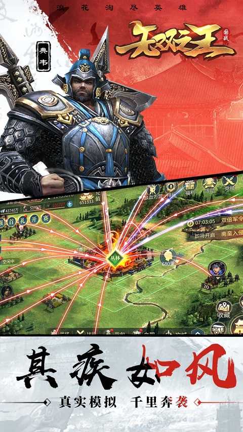 无双之王是一款以三国为背景的策略战争游戏,玩家的主要任务是通过内部管理、资源配置、城市建设等手段,开发自己的领地,逐步增强国家实力。这包括招募人才,比如历史上著名的文官、军事将领,用他们的智慧和勇气为自己的权力增添支持。