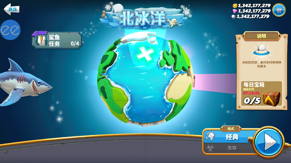 趣味的鲨鱼海底冒险游戏,可以解锁众多的鲨鱼进行战斗,吞噬周围的生物,与其他强大的boss对战,小编带来的是饥饿鲨世界修改器版,不打开修改器就是原版,打开修改器就可以获得无敌、钻石金币等功能。