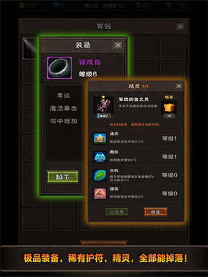 新手进去后,别打怪,先带法师去后面找牧师,然后给你一个二星精灵,看技能,是不是自己想要的,不是就设置里清除数据从进,总共五个角色,后面圣骑士,和刺客,记得低级图打金怪,紫色怪,金给钻石,紫给装备,高级图颜色怪就少了,每10层出现一个商人,买装备的,可以刷钱买点,等级高给的高不受层数限制,看运气,可以手机备份,10抽、刷红、绿、装、套装