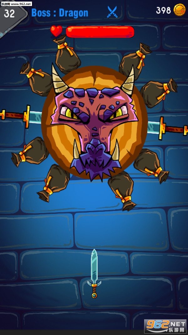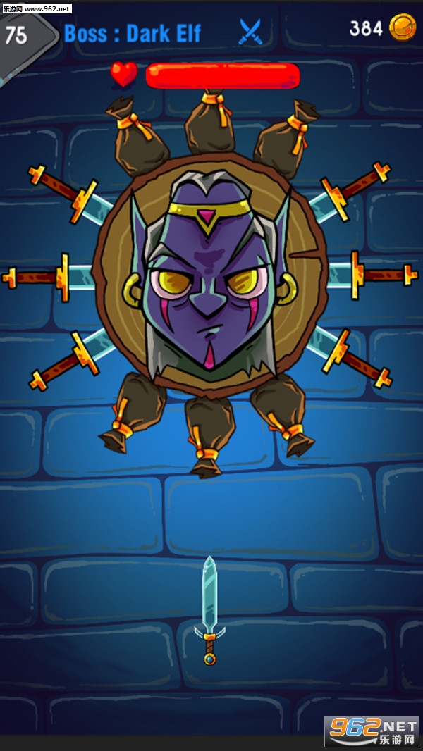 闯关的游戏模式,让每个关卡都是一个BOSS,你要将你手中的刀,插到BOSS的头上,当然不是那么容易的,你要找准时机,完美的避开障碍,才能插到BOSS的头上,将BOSS的血量耗完,你就闯关成功。