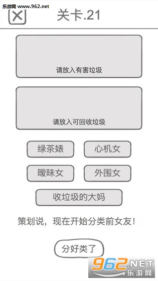 游戏还是非常有趣的,结合了当下最流行的垃圾分类话题,你可以在游戏中一边扔男友,一边了解垃圾分类的知识,游戏的立绘虽然比较简陋,但看起来相当沙雕,每一张图都可以做成表情包。一边游戏,一边收集表情,还能一边学习垃圾分类的知识了。