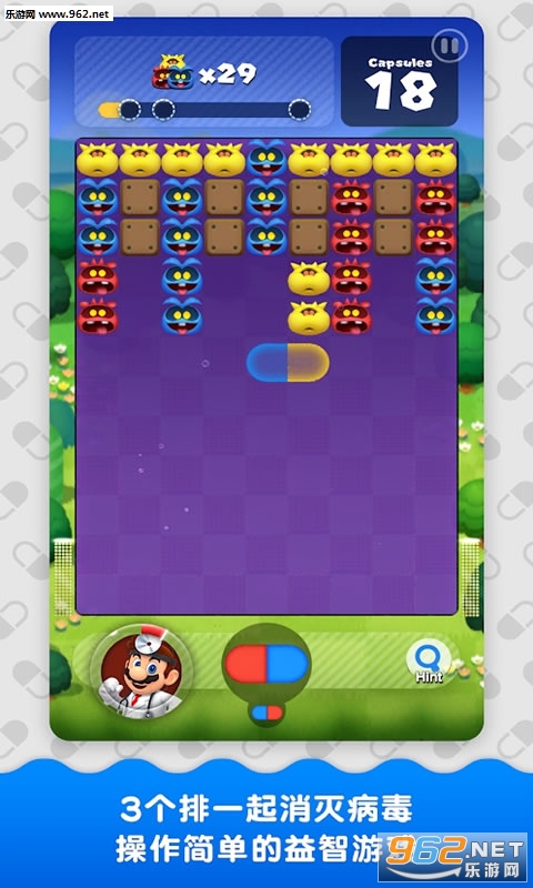 《马力欧医生世界国际版》是以老任的经典的马里奥题材设计的以经典FC为模板打造的可以多人对战的休闲手游,在这一次的马里奥世界中,玩家以医生的身份通过药丸的颜色搭配来消灭病毒,基本上延续了三消规则,但是在玩法上却又有一定的差别。