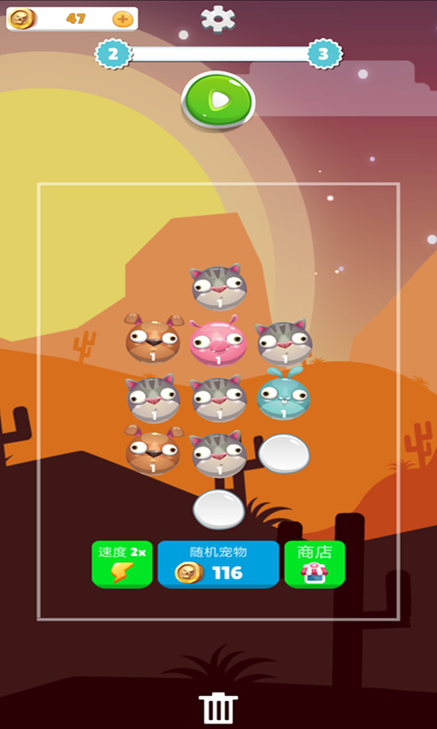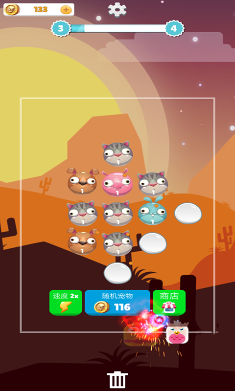 用小动物们填满骰子槽以增加攻击力,两个同样的小动物合成后攻击力更强,消灭掉沿着边线行走的小鸟。游戏在玩耍的过程中还可以暂停,你也可以设置游戏音效,还可以邀请你的好友和你一起玩耍。