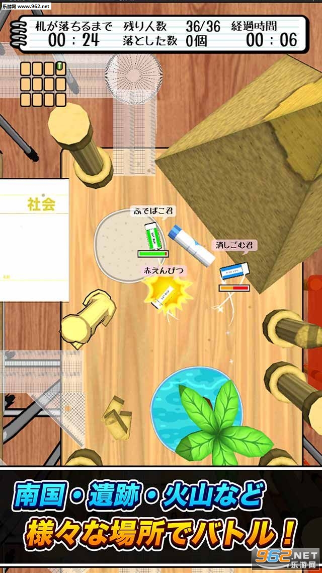 《橡皮擦掉落大逃杀游戏》是一款根据学生时代大家都使用过的橡皮擦为主角,融入当下最热门大逃杀玩法的多人竞技游戏,在这里,参与竞技的玩家要最快的速度将其他橡皮擦撞击到桌上的就可以获胜,游戏的战场自然就是教室中的多张桌子组成,它可能是遗迹、火山也可能是海边等等多个场地,等你来挑战解锁哦。