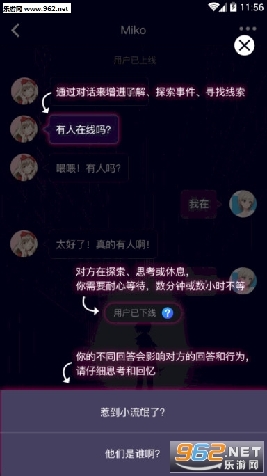 因完全采用模拟现实通讯,所以请注意你的消息,随时可能需要你的帮助。另外主角也需要睡眠时间以及活动时间,你需要等候主角上线才能继续进行对话交流。