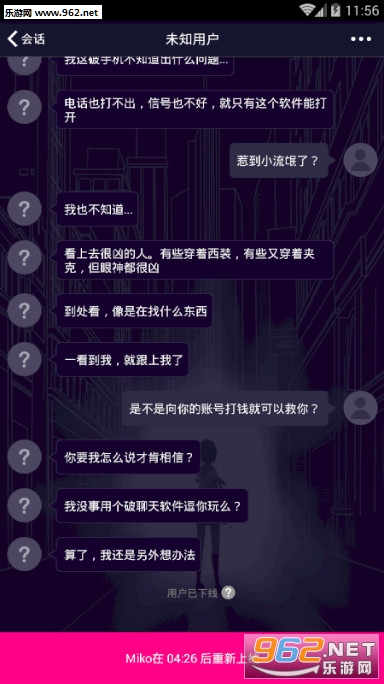 《异次元短信安卓版》是一款文字解谜游戏,一个神秘的聊天软件,有一天你通过这款软件接收到了名为miko的陌生人的求救短信,她正在被一群貌似很危险的人追捕,上线的时间不定,你要根据有限的时间和线索找到miko,并找出那群人追捕miko的真相。